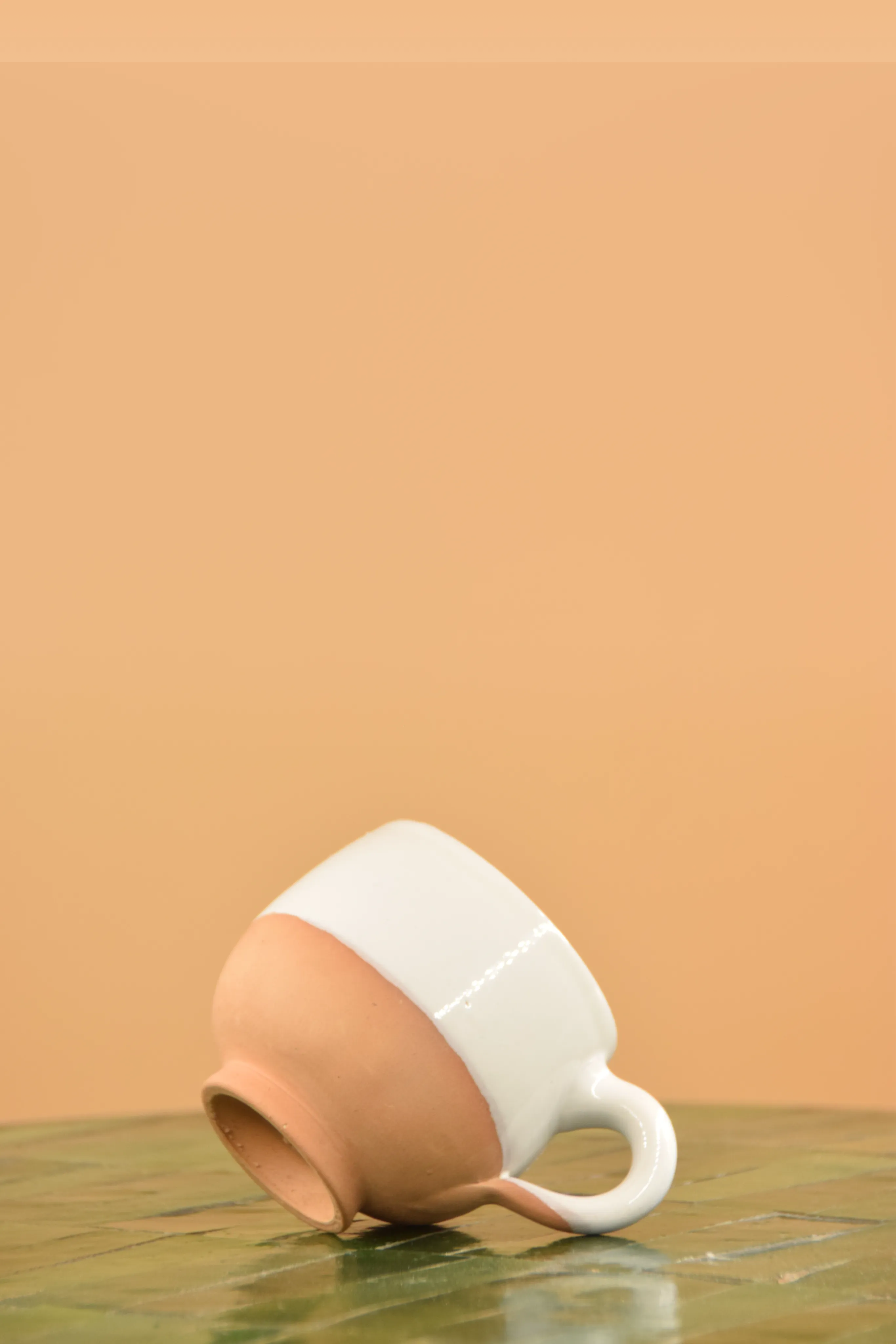 Chaque verre, mug ou tasse est partiellement émaillé, laissant apparaître la texture brute de la céramique mêlée à la douceur de l’émail.