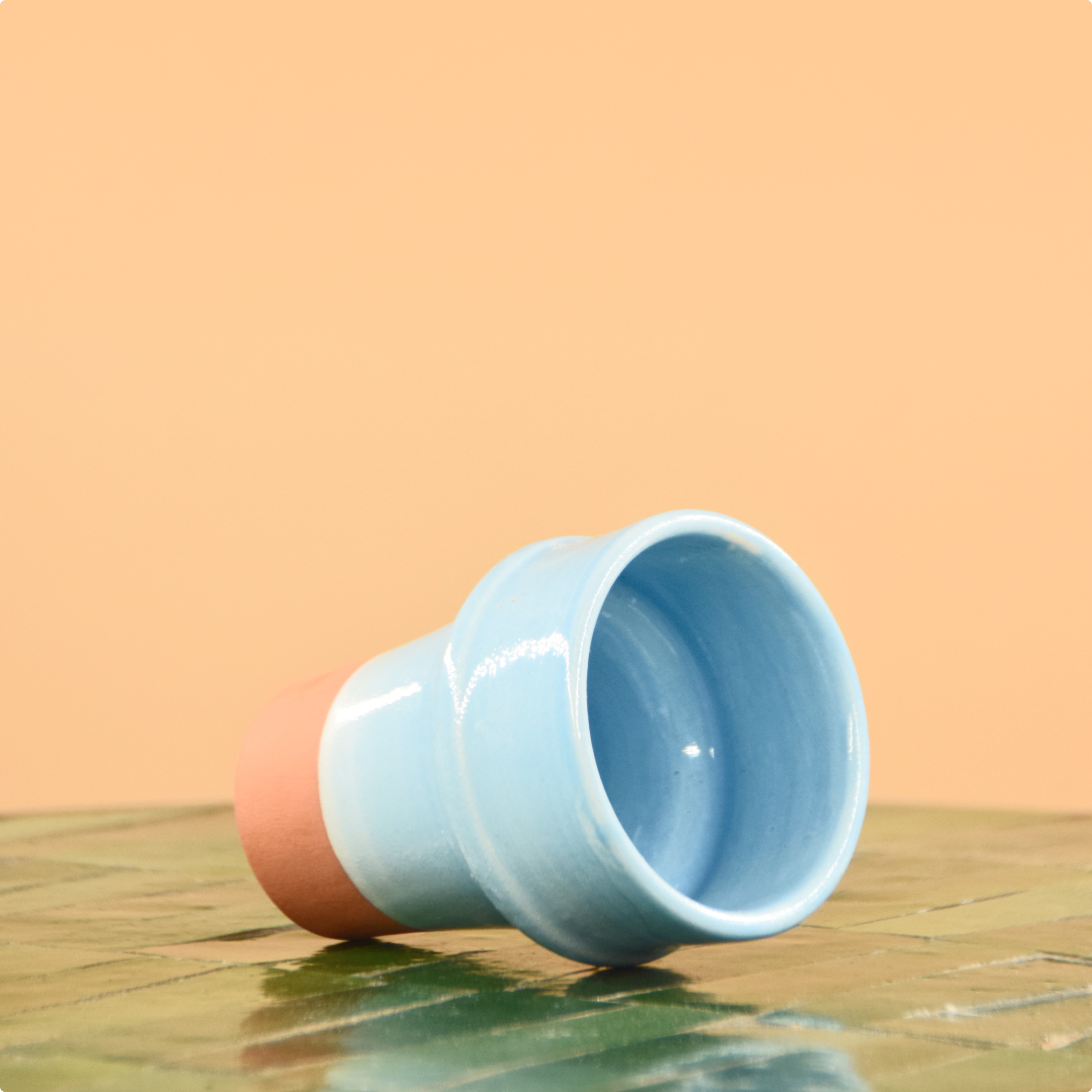 Chaque verre, mug ou tasse est partiellement émaillé, laissant apparaître la texture brute de la céramique mêlée à la douceur de l’émail.