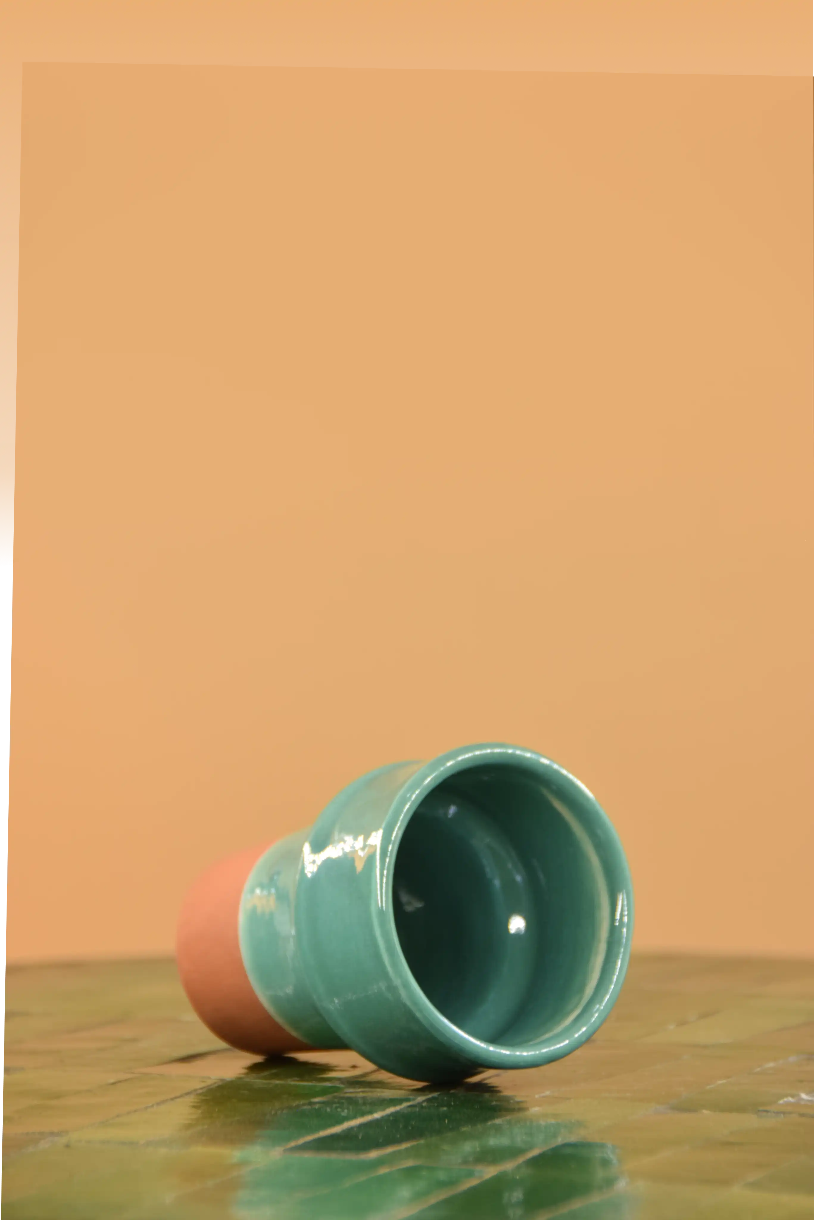 Chaque verre, mug ou tasse est partiellement émaillé, laissant apparaître la texture brute de la céramique mêlée à la douceur de l’émail.